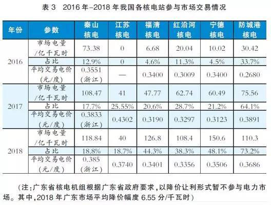 我國正在深化電力體制改革。從市場交易電量及市場化比率來看,核電企業(yè)市場化程度呈現(xiàn)逐年增加的趨勢,在運核電面臨計劃電量下調(diào)和市場競價的雙重壓力。根據(jù)2016年-2018年我國各核電站參與市場交易情況(見表3),部分省區(qū)核電部分電量競價上網(wǎng)時,已出現(xiàn)成本與電價成本倒掛的情況。部分省份在深化電改過程中,指令性下調(diào)核電計劃電量在內(nèi)的上網(wǎng)電價,使核電電價進一步降低。