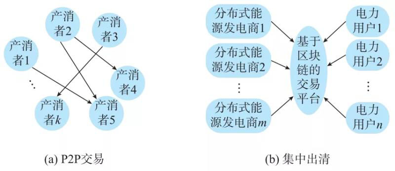 現(xiàn)階段基于區(qū)塊鏈的電力交易模式的理論研究與設(shè)計,主要可以分為兩類:一是研究個體間點對點交易,另一種是有中介優(yōu)化處理的集中出清,如圖1所示?;趨^(qū)塊鏈的點對點交易利用了區(qū)塊鏈技術(shù)去中心化和去信任的特性:在進(jìn)行此類交易時,只有發(fā)、用電兩側(cè)。交易前,雙方約定好合約內(nèi)容,無需第三方參加?;趨^(qū)塊鏈的集中出清需要借助區(qū)塊鏈技術(shù)公開透明的特性:對于基于區(qū)塊鏈的交易而言,需要有去中心化的交易平臺將買賣雙方的報價及需求聚集在一起進(jìn)行撮合匹配,形成供需曲線后出清。