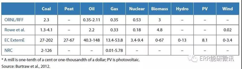 表ES.2:4項(xiàng)外部成本研究的估算匯總(mills*每千瓦時(shí)或美元/每兆瓦時(shí))