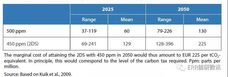 對(duì)大量不同氣候和能源模型中建立的2ds對(duì)應(yīng)的邊際成本進(jìn)行綜合分析,得出了2025年和2050年450和500ppm濃度目標(biāo)的邊際減排成本(MAC)值(見表ES.1)。這些數(shù)值意味著到2025年每噸二氧化碳的成本至少為100美元,到2050年每噸二氧化碳的成本至少為200美元。