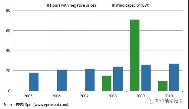 圖1.3 德國電力市場(chǎng)的風(fēng)電裝機(jī)和負(fù)價(jià)格