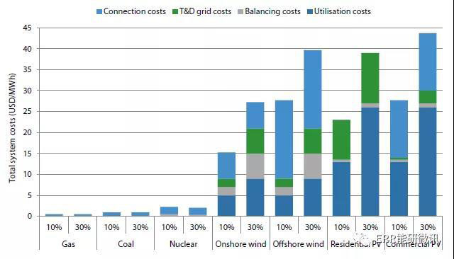 圖ES.3 VRE占10%和30%份額的發(fā)電技術(shù)的電網(wǎng)級(jí)系統(tǒng)成本