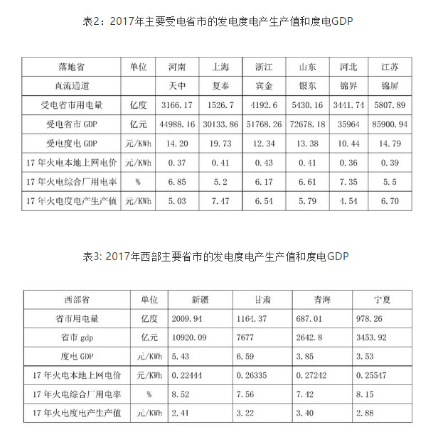 經(jīng)濟(jì)發(fā)展離不開(kāi)能源,最好、最方便、最安全的能源就是電,各省市GDP反映一個(gè)地方的經(jīng)濟(jì)總量,省市用電量也能反應(yīng)一個(gè)地方的經(jīng)濟(jì)狀況,省市度電產(chǎn)生GDP反映經(jīng)濟(jì)發(fā)展的質(zhì)量和動(dòng)力,體現(xiàn)地方經(jīng)濟(jì)發(fā)展的“含金量”。下面把主要受電省的2017年度電產(chǎn)生的GDP進(jìn)行統(tǒng)計(jì),受電省發(fā)電企業(yè)的度電產(chǎn)生產(chǎn)值進(jìn)行統(tǒng)計(jì),把西部主要送電省2017年度電產(chǎn)生的GDP進(jìn)行統(tǒng)計(jì),送電省發(fā)電企業(yè)的度電產(chǎn)生產(chǎn)值進(jìn)行統(tǒng)計(jì),具體數(shù)據(jù)見(jiàn)表2、3。