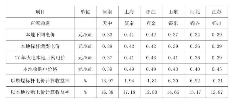 根據(jù)國(guó)家能源局關(guān)于2017年度全國(guó)電力價(jià)格情況監(jiān)管通報(bào),國(guó)網(wǎng)2017年電力市場(chǎng)交易信息報(bào)告,選取河南省,江蘇省、浙江、山東、上海、河北等省進(jìn)行分析,輸送電量分為水電、火電、新能源和火電打捆。根據(jù)落地省落地電價(jià)分別與落地省燃煤標(biāo)桿電價(jià)、本省電網(wǎng)電力平均收購(gòu)電價(jià)計(jì)算收益率見(jiàn)下表1。