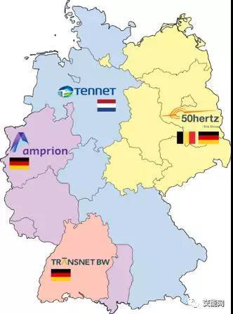 德國超過80%的電力來自4家大型跨區(qū)電力公司( E.ON、RWE、Vattenfall Europe、EnBw),其中前兩家占了60%。這4家電力公司所分離出的獨立主體又擁有整個德國輸電網(wǎng),供電范圍如下: