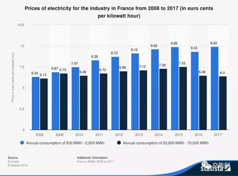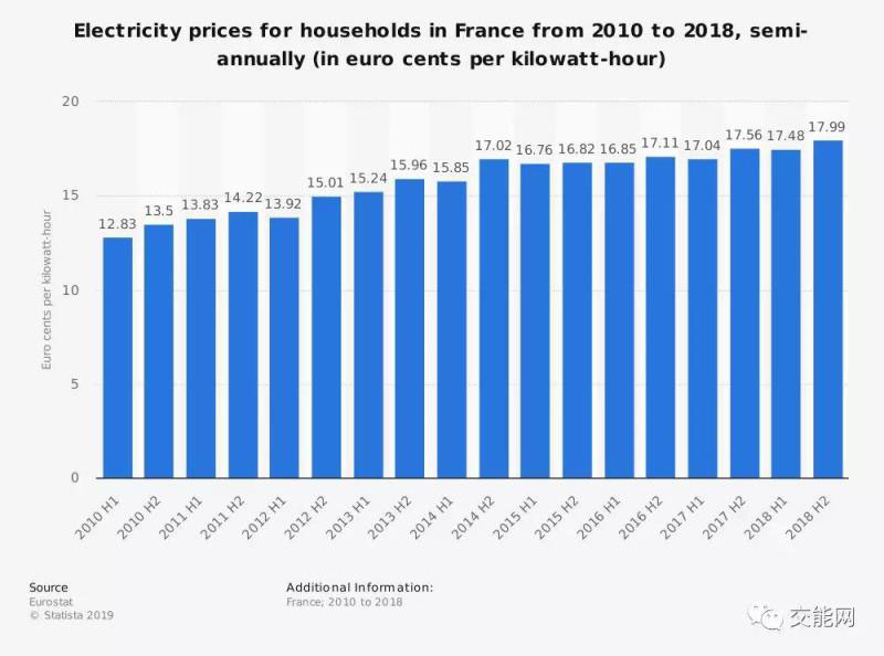 2018年法國民用電平均電價水平為0.18歐元每千瓦時,與2010年相比,上漲了約40%。