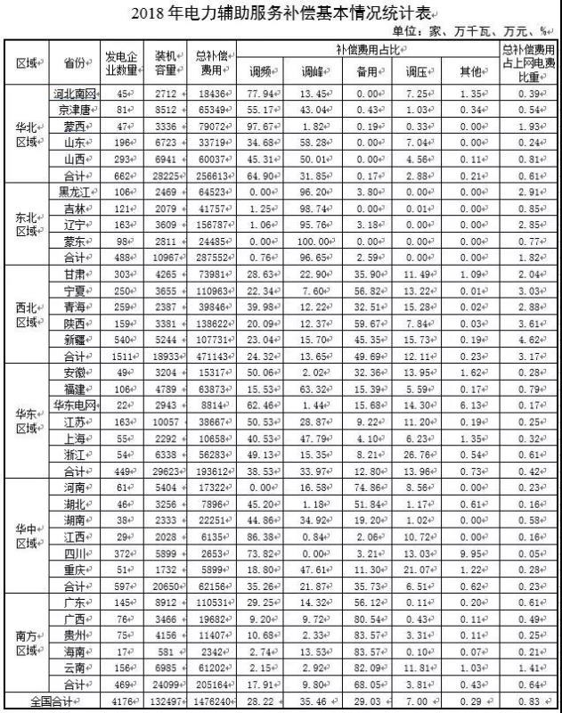 2018年,全國(guó)除西藏外31個(gè)?。▍^(qū)、市、地區(qū))參與電力輔助服務(wù)補(bǔ)償?shù)陌l(fā)電企業(yè)共4176家,裝機(jī)容量共13.25億千瓦,補(bǔ)償費(fèi)用共147.62億元,占上網(wǎng)電費(fèi)總額的0.83%(詳見(jiàn)附件)。