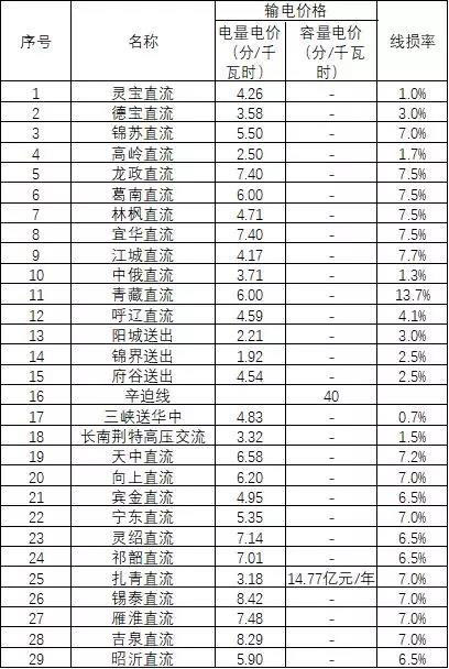 根據(jù)國家發(fā)展改革委《關(guān)于調(diào)整寧東直流等專項工程2018-2019年輸電價格的通知》(發(fā)改價格(2018 ) 225號)、《關(guān)于核定酒泉一湖南、寧東一紹興±800千伏特高壓直流工程輸電價格的通知》(發(fā)改價格(2018 ) 684號)及《關(guān)于核定部分跨省跨區(qū)專項工程輸電價格有關(guān)問題的通知》(發(fā)改價格〔2018 ] 1227號)文要求,公司各專項工程輸電價格如表所示。