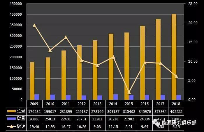 圖6 2009~2018年全國電力裝機(jī)及增速情況(單位:萬千瓦,%)