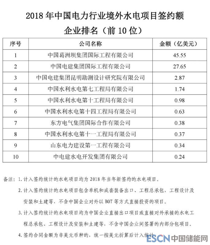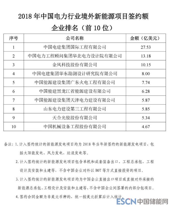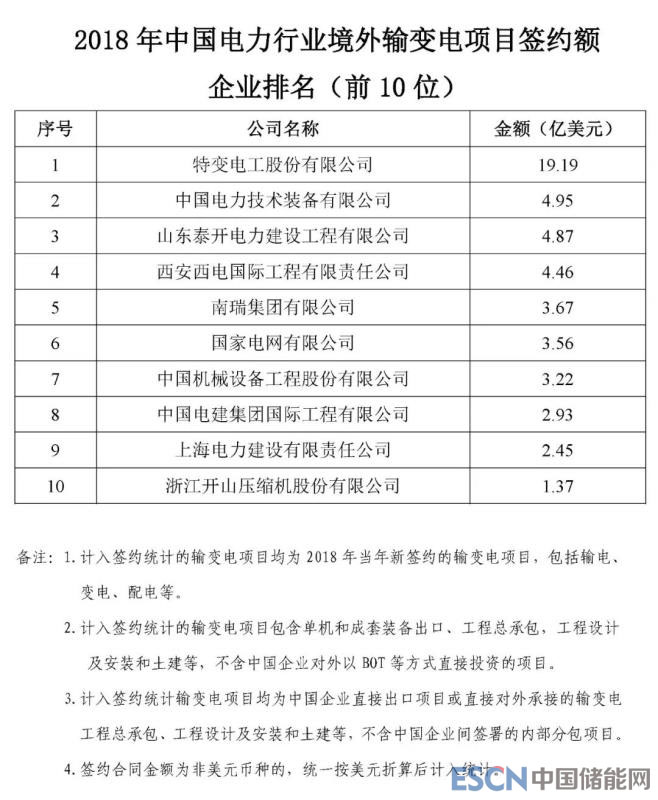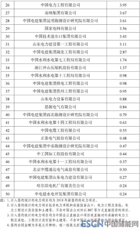根據機電商會統(tǒng)計,2018年,中國電力行業(yè)企業(yè)參與境外電力項目投(議)標并最終實現(xiàn)簽約的項目399個,簽約合同總金額466.8億美元,同比增長5.8%,簽約發(fā)電裝機總容量5013.7萬千瓦。根據各重點企業(yè)報送的2018年境外電力項目的新簽約情況,機電商會對企業(yè)簽約額進行了排名?,F(xiàn)將排名前50位的企業(yè)名單及各子行業(yè)簽約額排名前10位的企業(yè)名單予以發(fā)布。