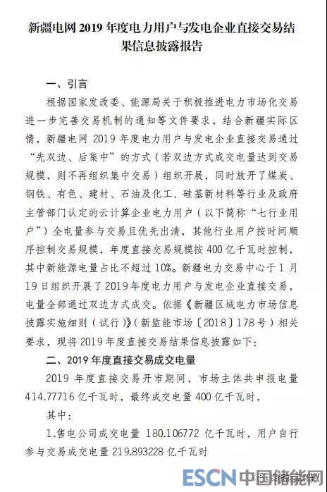 2月15日,新疆電力交易中心發(fā)布了《新疆電網(wǎng)2019年度電力用戶與發(fā)電企業(yè)直接交易結(jié)果信息披露報(bào)告》,2019年度直接交易開市期間,市場主體共申報(bào)電量414.77716億千瓦時(shí),最終成交電量400億千瓦時(shí),其中:售電公司成交電量180.106772億千瓦時(shí),用戶自行參與交易成交電量219.893228億千瓦時(shí)。