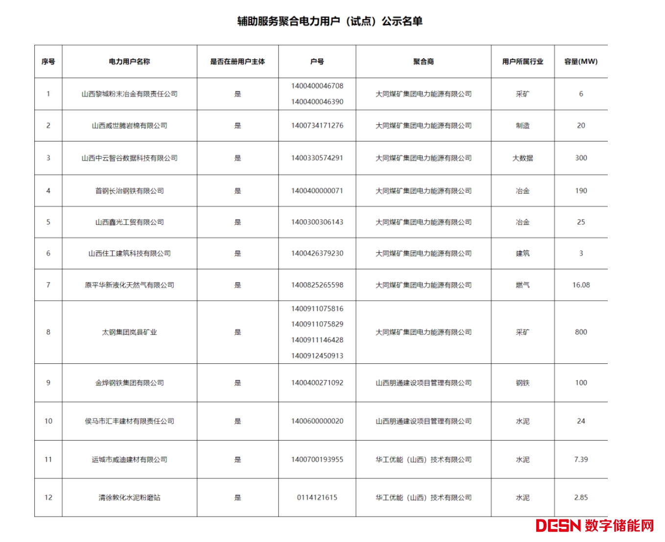 按照《山西能源監(jiān)管辦關(guān)于印發(fā)山西獨(dú)立儲能和用戶可控負(fù)荷參與電力調(diào)峰市場交易實施細(xì)則(試行)》(晉監(jiān)能〔2020〕14號)、《關(guān)于獨(dú)立儲能和用戶可控負(fù)荷參與電力響應(yīng)交易的補(bǔ)充通知》(晉監(jiān)能市場〔2021〕98號)文件要求,現(xiàn)將輔助服務(wù)聚合商大同煤礦集團(tuán)電力能源有限公司、山西朋通建設(shè)項目管理有限公司、華工優(yōu)能(山西)技術(shù)有限公司代理的企業(yè)(試點)予以公示,公示期為7天。公示期內(nèi)如有異議,可向山西能源監(jiān)管辦反映。