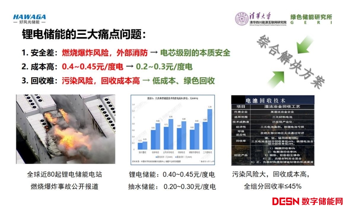 陳永翀表示, 目前鋰電儲(chǔ)能存在三個(gè)瓶頸問題,希望能有綜合方案加以解決: