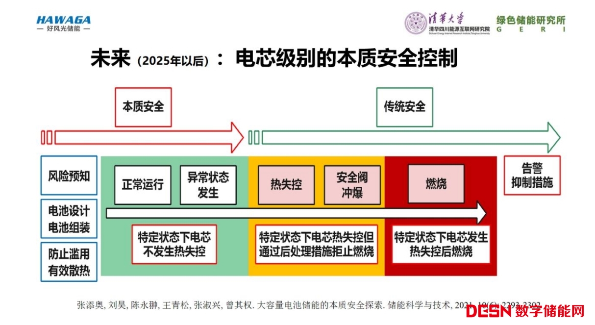 陳永翀說,本質(zhì)安全不等同于絕對(duì)安全。所以不能往“絕對(duì)安全”這個(gè)方向發(fā)展儲(chǔ)能,這是死胡同,也沒有必要。因?yàn)槔碚撋现v,任何含能量的載體都不可能做到絕對(duì)安全。但是有可能做到本質(zhì)安全。也就是電芯可以出問題,可以短路,可以有其他安全故障,但是絕對(duì)不要讓它熱失控?zé)饋恚丛谡9ぷ鳁l件和一定濫用條件下,電芯都不能發(fā)生熱失控,更不能發(fā)生燃燒和爆炸,這是電芯級(jí)別的本質(zhì)安全含義。鋰電儲(chǔ)能最早是從艙級(jí)消防水平發(fā)展到現(xiàn)在模組級(jí)別的安全控制,未來方向一定是往電芯級(jí)別的本質(zhì)安全發(fā)展。