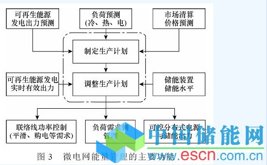 微電網(wǎng)的運(yùn)行優(yōu)化策略由能量管理系統(tǒng)在已知各種運(yùn)行信息的基礎(chǔ)上制定完成。目的是根據(jù)分布式電源出力預(yù)測、微電網(wǎng)內(nèi)能源需求、市場信息等數(shù)據(jù),按照不同的優(yōu)化運(yùn)行目標(biāo)和約束條件做出決策,實(shí)時制定微電網(wǎng)運(yùn)行調(diào)度策略,通過對分布式電源、儲能設(shè)備和負(fù)荷的靈活調(diào)度來實(shí)現(xiàn)系統(tǒng)的優(yōu)化運(yùn)行。能量管理系統(tǒng)的主要功能如圖3 所示。