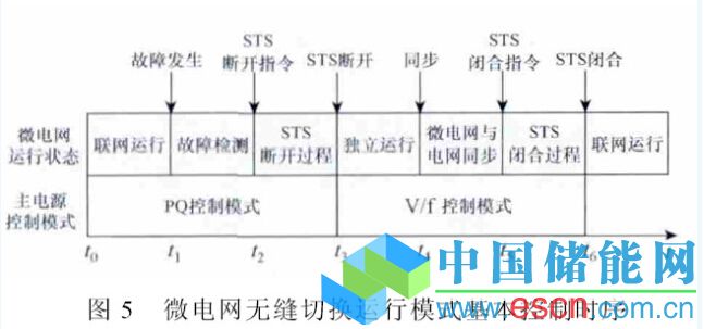 微電網(wǎng)運(yùn)行模式無縫切換控制也在第二層控制中實(shí)現(xiàn),該部分應(yīng)具備電網(wǎng)故障檢測、微電網(wǎng)與電網(wǎng)同步等功能,并對微電網(wǎng)并網(wǎng)靜態(tài)開關(guān)和主電源控制模式切換進(jìn)行協(xié)調(diào)控制[36]。當(dāng)采用主從控制模式時,一種典型的控制時序如圖5 所示,包含微電網(wǎng)運(yùn)行狀態(tài)切換和主電源控制模式切換。若主電源在微電網(wǎng)并網(wǎng)和孤立運(yùn)行模式下均采用P-f和Q-V下垂控制方法,則在微電網(wǎng)運(yùn)行模式切換時,無需切換控制模式[45]。否則,為保證微電網(wǎng)主電源控制模式平滑切換,主電源控制系統(tǒng)在PQ控制和V/f 控制模式之間切換時應(yīng)盡可能減少切換功率變化量[46]。