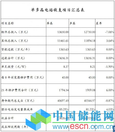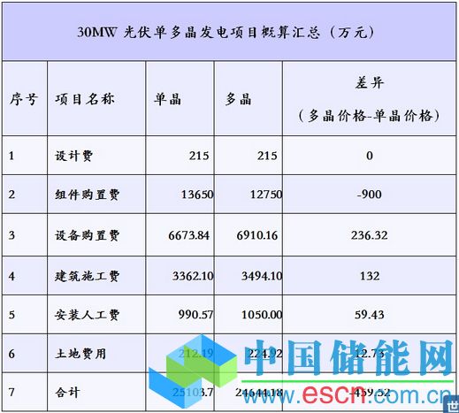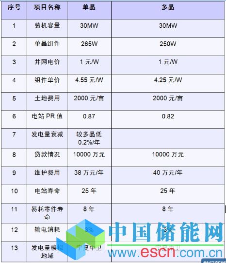 1、265W單晶和250W多晶,單晶組件售價以4.55元/W,多晶組件售價約為4.25元/W,根據(jù)30MWp電站EPC合同中各項項目單價算出電站初始投資:采用單晶組件電站投資約為8.37元/W,采用多晶組件電站投資約為8.22元/W;相差0.15元/W。