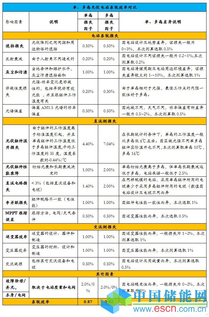 從光伏電站系統(tǒng)效率分析表中可以看出單多晶在發(fā)電效率方面因其晶體結(jié)構(gòu)差異有4個方向存在不同: