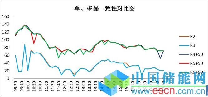 單多晶發(fā)電量與太陽輻射值的變化趨勢相似。根據(jù)最大功率點電子負(fù)載的阻值,反應(yīng)出單晶組件的一致性要比多晶組件的一致性好即非線性損失小于多晶。