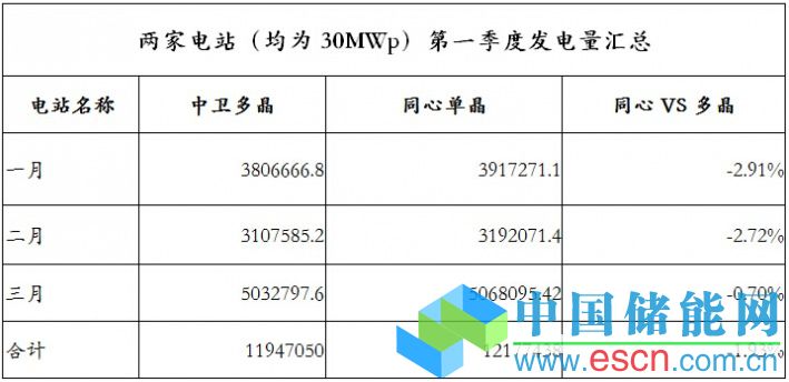 理論計算得出中衛(wèi)地區(qū)單多晶發(fā)電差異約-6.2%(多晶比單晶低);實際兩家電站第一季度發(fā)電量對比情況為多晶比同心差異為-6.52%。與計算模擬結(jié)果非常接近。