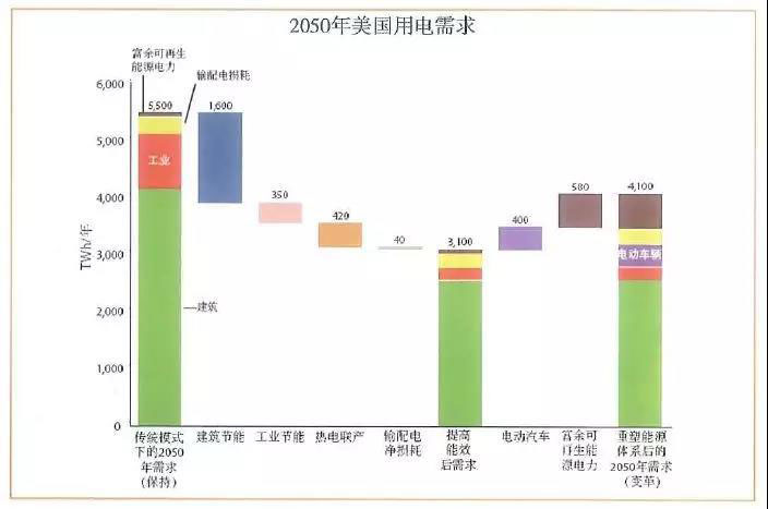 用戶的行為能讓電力部門適合供應(yīng)的轉(zhuǎn)變。建筑和工業(yè)的最終電力使用效益增幅可減小傳統(tǒng)發(fā)電需求。被廣泛采用的熱電聯(lián)產(chǎn)也可以減小這一需求。電動汽車使用更多的電力,但不多于其他地方節(jié)約的電力。整體使用量下降25%。保守起見,一體化設(shè)計的節(jié)電量井未在圖中體現(xiàn)。