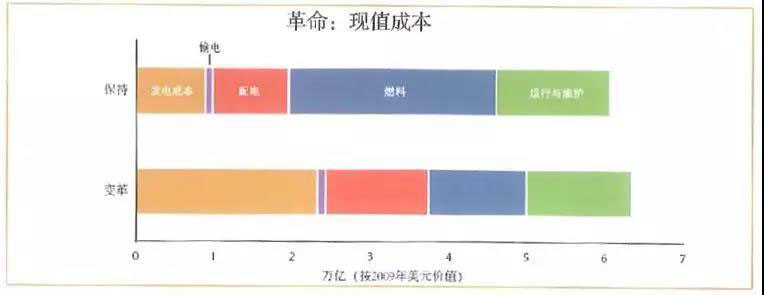 “革命情景”的現(xiàn)值成本(2010年)略高于保持情景。盡管其資金成本具有較高不確定性(取決于待續(xù)的技術(shù)成本降低),并且部分超出成本可被“革命情景”較低的燃料成本所避免的不確定性抵消掉。但是,金融經(jīng)濟(jì)學(xué)知識正在改變這一狀況。