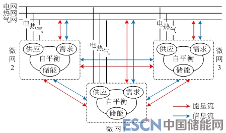 能源系統(tǒng)演化發(fā)展的基本單元是多能“供-需-儲”自平衡體,對應(yīng)園區(qū)微網(wǎng)[12],如圖2所示。微網(wǎng)通過股權(quán)并購打破能源各自運(yùn)營管控壁壘,利用互聯(lián)網(wǎng)和信息技術(shù)拉近能源生產(chǎn)和消費(fèi)距離,形成園區(qū)內(nèi)多能“供-需-儲”自平衡體。廣域范圍內(nèi)自平衡體在信息和經(jīng)濟(jì)激勵(lì)引導(dǎo)下,自主決策擴(kuò)展,與其他能源主體或自平衡體實(shí)現(xiàn)物理網(wǎng)絡(luò)互聯(lián),形成新互聯(lián)網(wǎng)絡(luò)、新自平衡體的過程,是能源系統(tǒng)演化發(fā)展的過程。能源系統(tǒng)演化發(fā)展是基于物理-信息-經(jīng)濟(jì)耦合的多個(gè)自平衡體交互,自適應(yīng)分散決策的結(jié)果。單個(gè)自平衡體與整個(gè)能源系統(tǒng)是個(gè)體與環(huán)境的關(guān)系,個(gè)體適應(yīng)環(huán)境也造就環(huán)境。園區(qū)微網(wǎng)是能源系統(tǒng)演化發(fā)展的起點(diǎn)和落腳點(diǎn)。