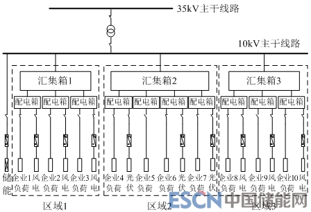 微網(wǎng)分為3塊區(qū)域,均為大工業(yè)用戶,電壓等級為10kV,最大負(fù)荷為11.13MW。項(xiàng)目壽命周期為20年,設(shè)備綜合造價(jià)及相關(guān)成本參考當(dāng)?shù)貥?biāo)準(zhǔn),基準(zhǔn)折現(xiàn)率取7%。傳統(tǒng)運(yùn)營模式下微網(wǎng)項(xiàng)目總投資約1.62億元,其中源側(cè)約14500萬元,網(wǎng)側(cè)投約310萬元,儲側(cè)約900萬元,信息化平臺(能量管理系統(tǒng))約500萬元;一體化運(yùn)營模式總投資約1.68億元,其中源網(wǎng)儲側(cè)投資變化不大,信息化平臺(大數(shù)據(jù)云計(jì)算平臺、微平衡市場交易系統(tǒng)、能量管理系統(tǒng))約1100萬元。圖7為微網(wǎng)接線方案示意圖。
