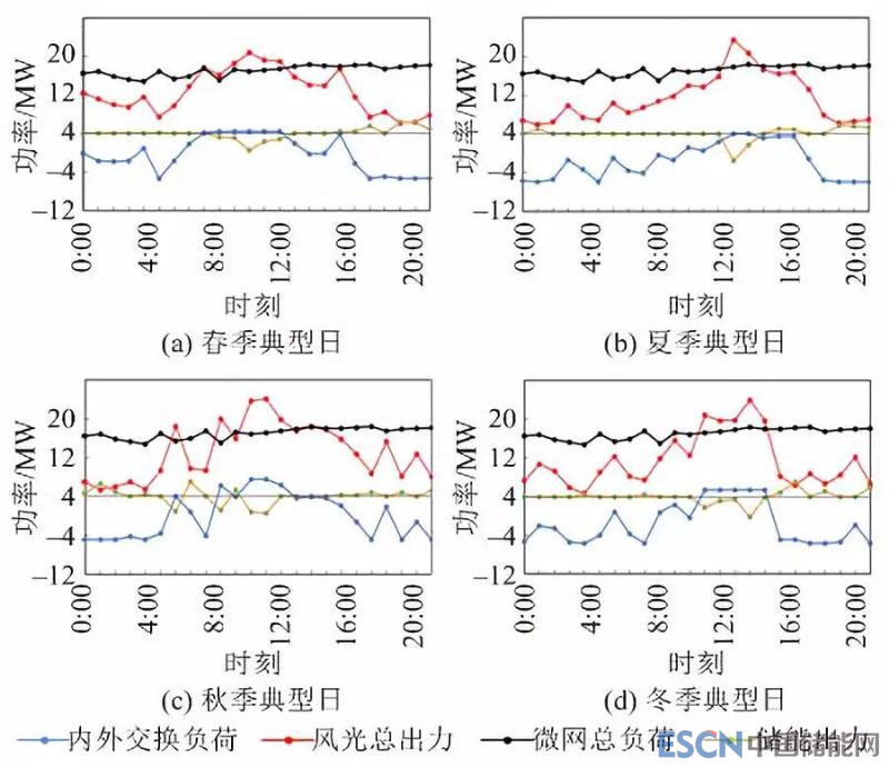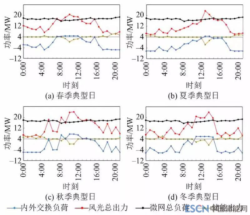 圖9和圖10為傳統(tǒng)運(yùn)營模式和一體化運(yùn)營模式下,春、夏、秋、冬四季典型日微網(wǎng)的運(yùn)行情況(儲能出力負(fù)值表示充電,內(nèi)外交換負(fù)荷負(fù)值表示外。