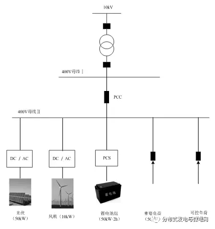 微電網(wǎng)系統(tǒng)由風(fēng)機(jī)、光伏電源、儲(chǔ)能電池、變流器、負(fù)荷、配電網(wǎng)控制系統(tǒng)等組成。發(fā)電側(cè)包含風(fēng)機(jī)、光伏電源、儲(chǔ)能電池等,通過變流器將微源的輸出轉(zhuǎn)換為滿足并網(wǎng)條件的電能;用電側(cè)根據(jù)負(fù)荷優(yōu)先級(jí)的不同,分為重要負(fù)荷與可控負(fù)荷。