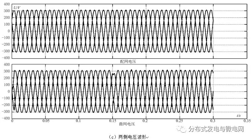 2)0.06s后啟動(dòng)MGCC,從儲(chǔ)能運(yùn)行于PQ控制,按照上層EMS的指令放電(5kW);