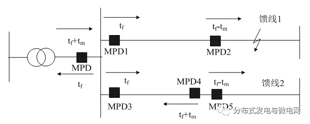 當(dāng)線路的F處出現(xiàn)故障時,保護(hù)設(shè)備MPD、MPD1、MPD2會同時檢測到系統(tǒng)故障,但MPD2會優(yōu)先動作,而后備保護(hù)MPD和MPD1會根據(jù)需要延時動作。往往微電網(wǎng)的規(guī)模都比較小,沒有較長的輸電線路,基本不存在電源通過一條饋線接入的情況,因此通過該保護(hù)方案就可以滿足保護(hù)需要[5]。