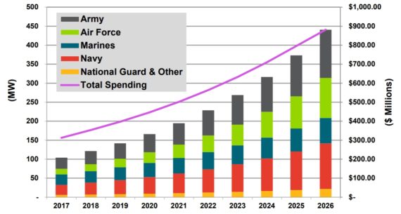 Navigant Research因此得出結(jié)論:通過使用微型電網(wǎng),國防部將能夠減少其目前在其523座設(shè)施和28萬座建筑物上花費的40億美元能源消耗。此外,Navigant預(yù)測,年度微電網(wǎng)的支出將從2017年的4.534億美元增加到2026年的14億美元。