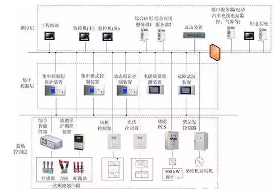 微電網(wǎng)的體系結(jié)構(gòu)一般采用國(guó)際上比較成熟的三層結(jié)構(gòu)(許繼的示范工程也是如此):配電網(wǎng)調(diào)度層、微電網(wǎng)集中控制層、分布式電源和負(fù)荷就地控制層。