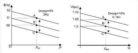下垂控制:即選擇與傳統(tǒng)發(fā)電機(jī)相似的頻率一次下垂特性曲線(DroopCharacter)作為控制方式,即分別通過(guò)P/f下垂控制和Q/V下垂控制來(lái)獲取穩(wěn)定的頻率和電壓,這種控制方法對(duì)微網(wǎng)中的微源輸出的有功功率和無(wú)功功率分別進(jìn)行控制,無(wú)需機(jī)組間的通信協(xié)調(diào),實(shí)現(xiàn)了微源即插即用和對(duì)等控制的目標(biāo)。