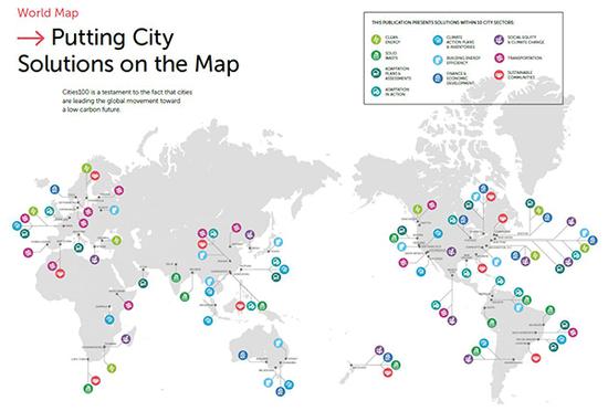 100城項目分布圖。本文圖片除特殊標(biāo)注外均來自:100 solutions for climate action in cities