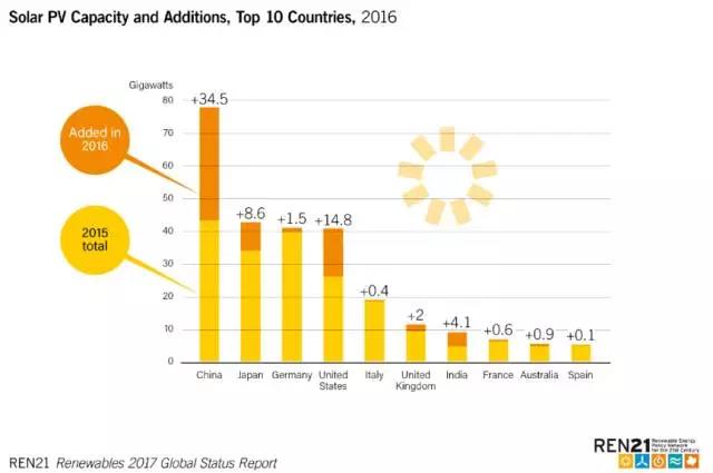 主要國家2016年太陽能光伏新增和累計(jì)裝機(jī)容量