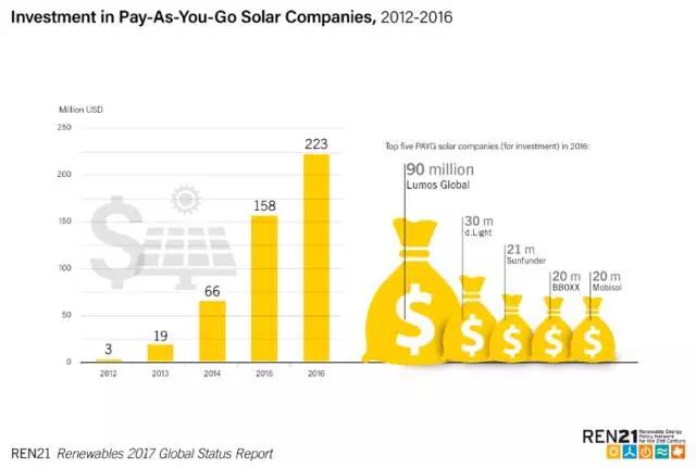 在發(fā)展中國家,無論是微網(wǎng)還是獨(dú)立系統(tǒng)市場(chǎng)都在快速發(fā)展。由移動(dòng)技術(shù)作為支持的隨收隨付(Pay-As-You-Go, PAYG)商業(yè)模式也十分活躍。市場(chǎng)對(duì)這一領(lǐng)域的投資迅速從2012年的300萬美元上升至2.23億美元。目前,微網(wǎng)市場(chǎng)每年的增長都超過2000億美元。2016年,僅在風(fēng)電和光伏領(lǐng)域就啟動(dòng)了超過23MW的微網(wǎng)項(xiàng)目。