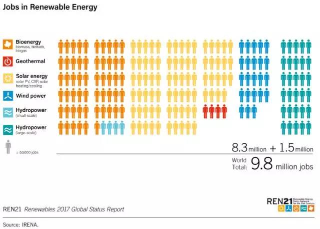 投資的增長帶來了更多的就業(yè)崗位。截至2016年全球范圍內(nèi)共有980萬人從事同可再生能源有關(guān)的工作??稍偕茉床粌H能解決化石能源領(lǐng)域的失業(yè)難題,同時(shí)也會(huì)成為全球經(jīng)濟(jì)的主要驅(qū)動(dòng)力。