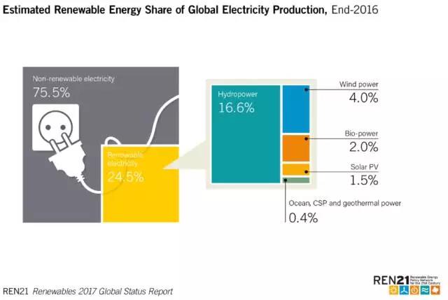 2016年全球電力生產(chǎn)中不同類型能源所占比例