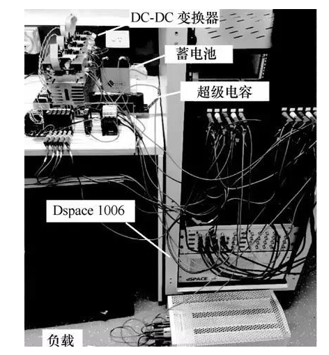 為對(duì)理論分析結(jié)果進(jìn)行實(shí)驗(yàn)驗(yàn)證,本文搭建了含有蓄電池/超級(jí)電容混合儲(chǔ)能系統(tǒng)的直流微網(wǎng)實(shí)驗(yàn)平臺(tái),如圖8所示。LiFePO4電池、超級(jí)電容作為混合儲(chǔ)能系統(tǒng)的電源輸入,經(jīng)過(guò)雙向Boost DC- DC雙向變換器接入直流母線,為電阻負(fù)載Rload提供電能。