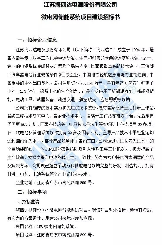 中國儲(chǔ)能網(wǎng)訊:海四達(dá)擬建設(shè)1MW微電網(wǎng)儲(chǔ)能系統(tǒng)項(xiàng)目?,F(xiàn)該項(xiàng)目對(duì)外招標(biāo),邀請(qǐng)有資質(zhì)、有實(shí)力的方案設(shè)計(jì)、承建公司來我司參加競標(biāo)。