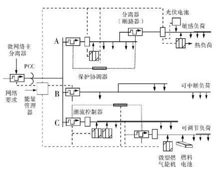 與大部分微電網(wǎng)一樣,該微電網(wǎng)內(nèi)含有多種微電源形式。為充分利用能量,在可以產(chǎn)生熱量的微電源附近安裝有熱力驅(qū)動的負荷。微網(wǎng)中還配備了保護協(xié)調(diào)器和潮流控制器,以實現(xiàn)對微電網(wǎng)系統(tǒng)的保護和有效控制。與其他微網(wǎng)不同,該微電網(wǎng)結構依據(jù)供電質(zhì)量的要求不同,把負荷分為三類,即敏感負荷、可調(diào)節(jié)負荷、可中斷負荷,再對各類負荷進行不同優(yōu)先級的管理[2]。