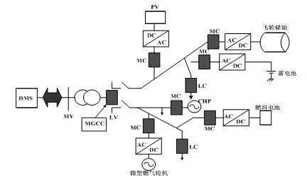 圖2是歐盟關于微電網(wǎng)定義的典型結構圖,此結構圖中包括多種能源利用形式,系統(tǒng)中還配備了飛輪儲能與蓄電池兩種可靠的儲能單元,為系統(tǒng)的穩(wěn)定運行提供了保障。除此之外,歐盟也非常重視微網(wǎng)的控制,在每種發(fā)電形式的出口端安裝有微電源控制器(MC),負載的輸入端也接上了負載控制器(LC)。整個微網(wǎng)系統(tǒng)利用靜態(tài)開關實現(xiàn)與主電網(wǎng)的通斷,當靜態(tài)開關閉合,微電網(wǎng)與主電網(wǎng)相連,高壓側(cè)的電壓經(jīng)變壓后需先經(jīng)過微電網(wǎng)控制器(MGCC)才能正式接入微電網(wǎng),這就維持了微網(wǎng)的最優(yōu)運行,并且允許微網(wǎng)作為一個整體向大電網(wǎng)供電。