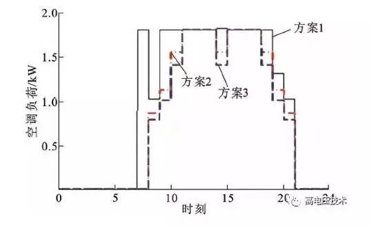 由于空調(diào)和電動汽車等設備日用電量較大,在優(yōu)化調(diào)度時應在滿足用戶基本用電需求的情況下盡可能地降低空調(diào)功率,同時將電動汽車的充電時間移至夜間電價低時段,避免在電價高峰時段對電動汽車充電。電熱水器和洗衣機等負荷由于使用時間相對較為固定,可在日常習慣的基礎上對使用時間作出適當調(diào)整,以減少用戶的電費支出。在舒適度方面,方案2對用戶的舒適度影響最大,方案3次之,方案1對舒適度無影響。