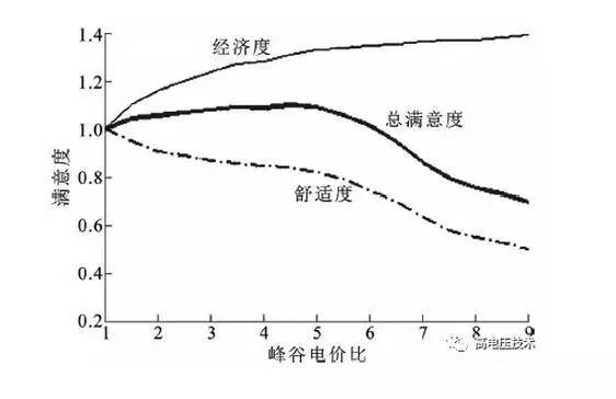隨著峰谷電價比的提高,用戶的用電經(jīng)濟度逐漸提升,而用電舒適度則逐漸下滑,綜合滿意度呈現(xiàn)出先升后降的趨勢。當峰谷電價比<6時,用戶的總體滿意度>1,并在峰谷電價比為4.5時達到最大值;當峰谷電價比>6時,用戶的總滿意度<1,此時峰谷電價比越大,總滿意度越低。由此可見,合理的峰谷電價比是引導用戶積極參與需求側響應的重要因素。峰谷電價比設置過低,則用戶參與需求側響應的激勵不足,達不到電網(wǎng)削峰填谷的目的;而峰谷電價比設置過高,則會降低用戶的滿意度,損害用戶參與需求側響應的積極性,同樣不利于需求側響應的實施和推廣。