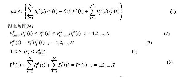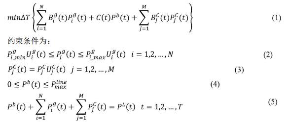 式中:ΔT為單位時(shí)間間隔;N為分布式供應(yīng)商的數(shù)量; 為供應(yīng)商i在t時(shí)段的報(bào)價(jià);為供應(yīng)商i在t時(shí)段的出力;C(t)為t時(shí)段市場(chǎng)電價(jià);Pb(t)為t時(shí)段從電網(wǎng)的購(gòu)電量;M為參與可控負(fù)荷報(bào)價(jià)的用戶數(shù); 為用戶j在t時(shí)段的可控負(fù)荷報(bào)價(jià); 為用戶j可控負(fù)荷的量,為用戶j削減負(fù)荷的量; 和分別為供應(yīng)商i的最小和最大出力;和 分別表示供應(yīng)商i和用戶j被接受的狀態(tài)變量,其值為1時(shí),表示被接受,為0時(shí)表示未被接受; 為公共線路所允許的最大傳輸功率;PL(t)為t時(shí)段的負(fù)荷預(yù)測(cè)值。