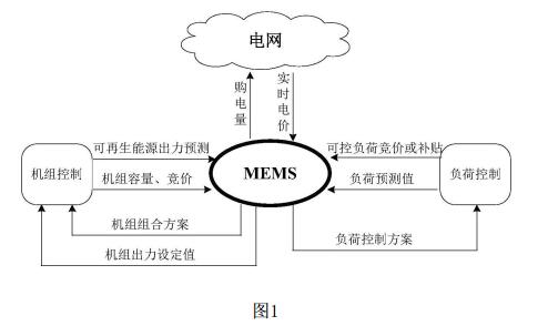 微網(wǎng)能量管理系統(tǒng)(Microgrid Energy Management System ,MEMS)負(fù)責(zé)微網(wǎng)的經(jīng)濟(jì)穩(wěn)定運(yùn)行,在市場(chǎng)環(huán)境中,類似于一個(gè)的獨(dú)立調(diào)度機(jī)構(gòu),通過(guò)收集各方面信息,經(jīng)過(guò)處理后制定相應(yīng)的生產(chǎn)計(jì)劃,再將方案通知給底層控制單元,其基本信息交換過(guò)程如圖1所示。