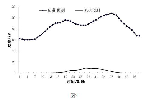 圖2是典型的負(fù)荷預(yù)測(cè)和光伏出力預(yù)測(cè)圖;