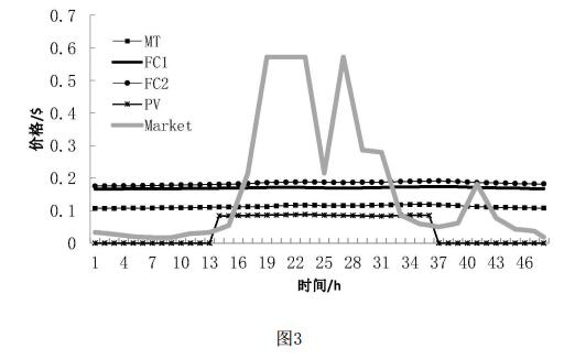 在實(shí)時(shí)電價(jià)相對(duì)較低,能量管理系統(tǒng)向電力市場(chǎng)購(gòu)電 ,成本較高的分布式供電商在某些時(shí)段未被采用;在實(shí)時(shí)電價(jià)較高時(shí),微網(wǎng)減少向電力市場(chǎng)購(gòu)電,選擇本地供電商的機(jī)組供應(yīng);